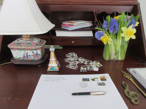 Along with the art I’ll share many of my favorite things, things I discovered along the way which add a lot of pleasure to my days. Things like rituals – specifically a ritual for letter writing. If we have the materials ready, on hand, and if we have a system for when to write, where to write, whom to write – then it’s pretty easy to be in the mood to write letters and to actually write them.